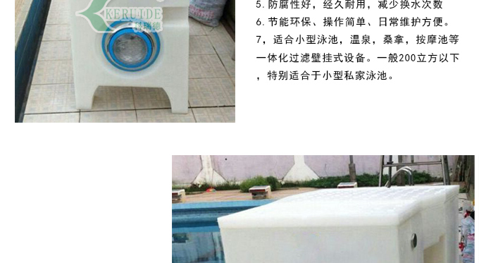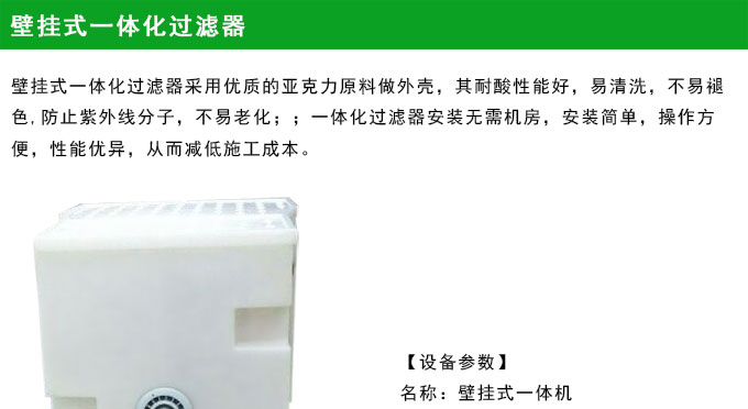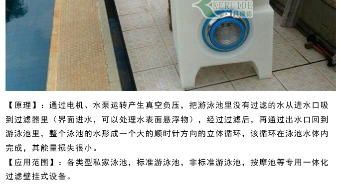 【應(yīng)用范圍】:各類型私家泳池,標(biāo)準(zhǔn)游泳池,非標(biāo)準(zhǔn)游泳池,按摩池等專用一體化過(guò)濾壁掛式設(shè)備。??