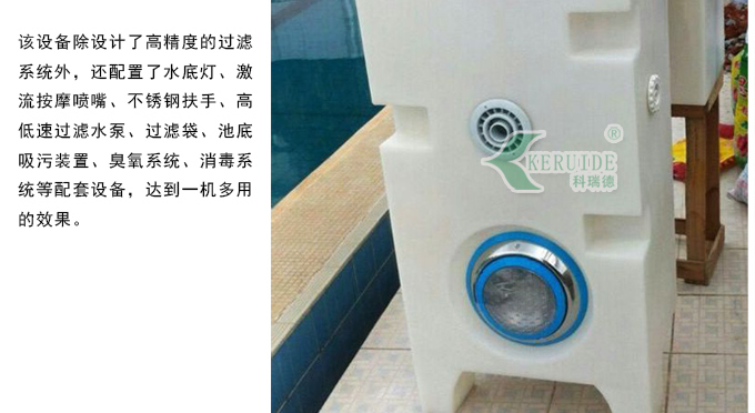 4.它自帶過(guò)濾,消毒,沖浪,吸污,扶梯,燈光等一體化.