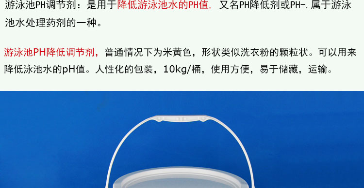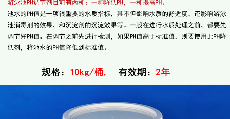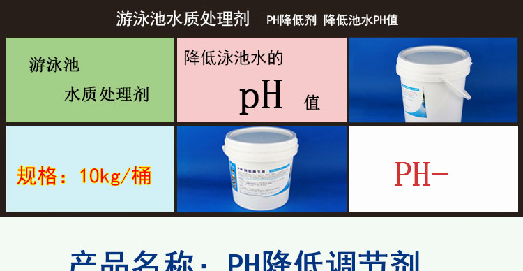 泳池水的PH值是一項重要的水質(zhì)指標,其不但影響水質(zhì)的舒適度,還影響游泳池消毒劑的效果,和沉淀劑的沉淀效果等。一般在進行水質(zhì)處理之前,都要首先調(diào)節(jié)好PH值。在調(diào)節(jié)之前先進行檢測,如果PH值高于標準值,則要使用此PH降低劑,將池水的PH值降低到標準值。