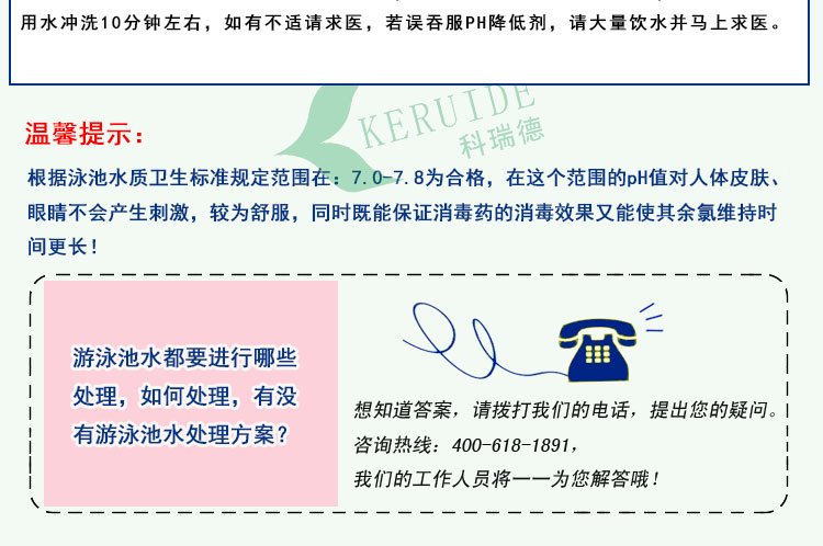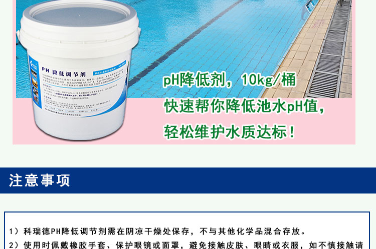 科瑞德PH降低調(diào)節(jié)劑也叫做PH降低劑,或PH減,PH-,是PH調(diào)節(jié)劑的一種。主要用于各類游泳池、桑拿池、溫泉池。其作用是將池水過高的PH值降低到合適的范圍。較適合的PH值為7.0-7.8,在這個PH范圍內(nèi),對人體皮膚、眼睛不會產(chǎn)生刺激并且能維持消毒效果持久。