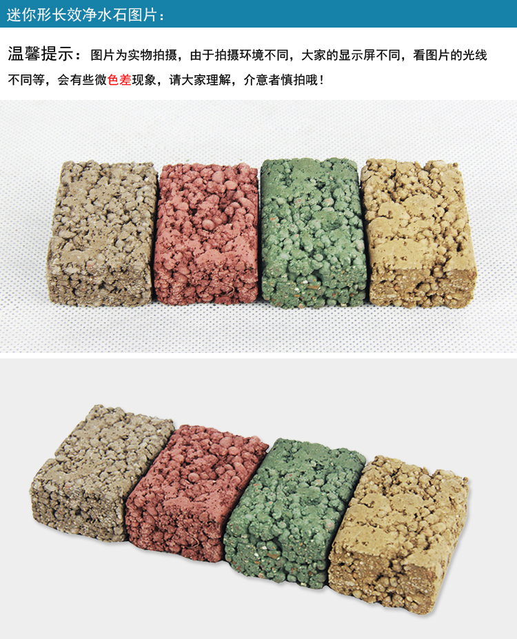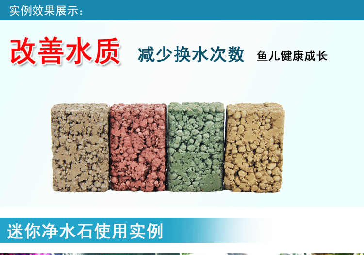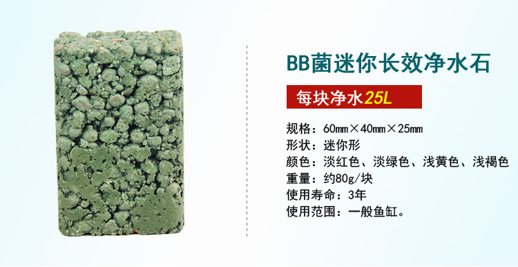 迷你長效凈水石是魚缸凈水石的一種,也叫做BB菌凈水石。其由輕量骨材、水泥、顏料、水制成,制作過程中封入bb菌,主要用于魚缸凈化水質,可以有效分解魚糞、魚食殘渣,除去氨氮等廢物,從根源上除去臭味,凈化水質。