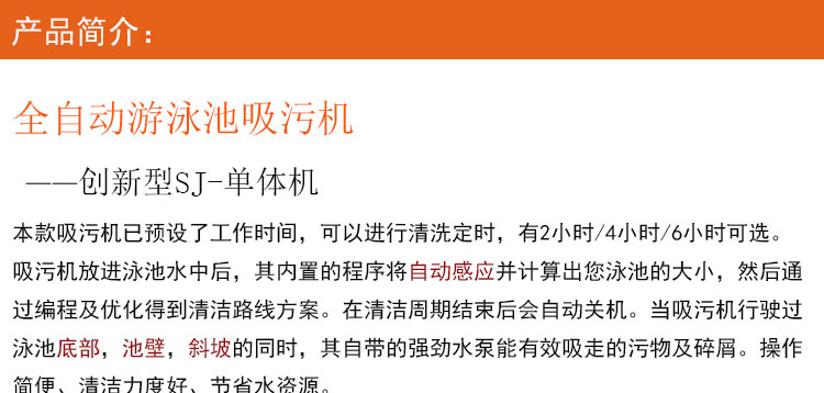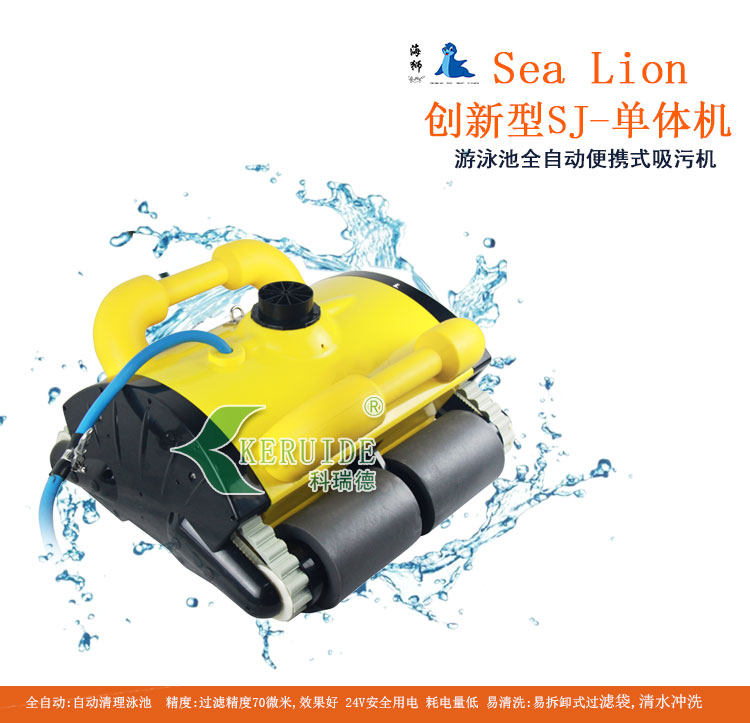 本款吸污機(jī)為全自動(dòng)游泳池吸污機(jī),主要是針對(duì)池底面積為100-600平方米左右的泳池。其創(chuàng)新實(shí)用,智能。其型號(hào)為創(chuàng)新型SJ-單體機(jī),也叫海獅自動(dòng)泳池吸污機(jī)。本款吸污機(jī)24V安全電壓、耗電量低、操作也簡(jiǎn)單、吸污力強(qiáng)、爬行性能好,并且自帶小推車(chē),便于使用及保存。