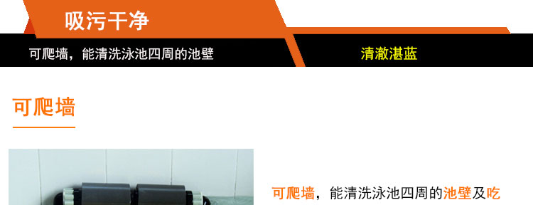 吸污徹底:可爬墻,能清洗泳池四周的池壁及吃水線(與空氣接觸的部分)。