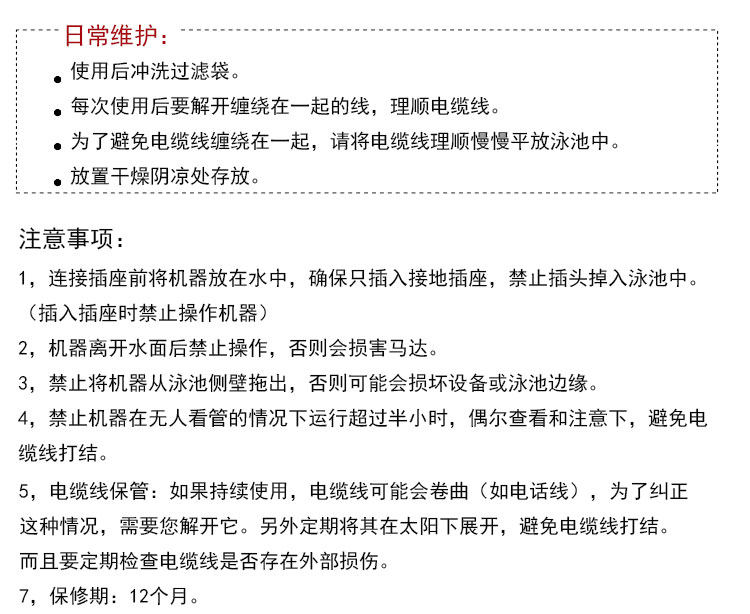 使用方法:使用方法簡(jiǎn)單,取出全自動(dòng)吸污機(jī),理順電纜線,慢慢平放到泳池中,插上電源,打開(kāi)開(kāi)關(guān),設(shè)定工作時(shí)間,它便會(huì)自己清理泳池。其內(nèi)置的微型電腦將自動(dòng)感應(yīng)并計(jì)算出您泳池的大小,然后通過(guò)遙控選擇清潔的時(shí)間如2小時(shí),3小時(shí)等。在清潔周期結(jié)束后清理過(guò)濾袋內(nèi)的臟物。初次使用時(shí)請(qǐng)按設(shè)定的6個(gè)小時(shí)的時(shí)間讓其運(yùn)行完一個(gè)完整的周期,讓其能記憶泳池的大小。