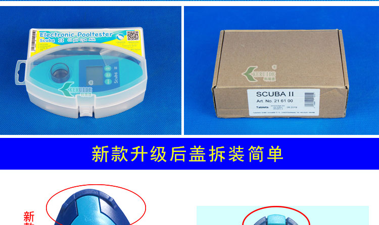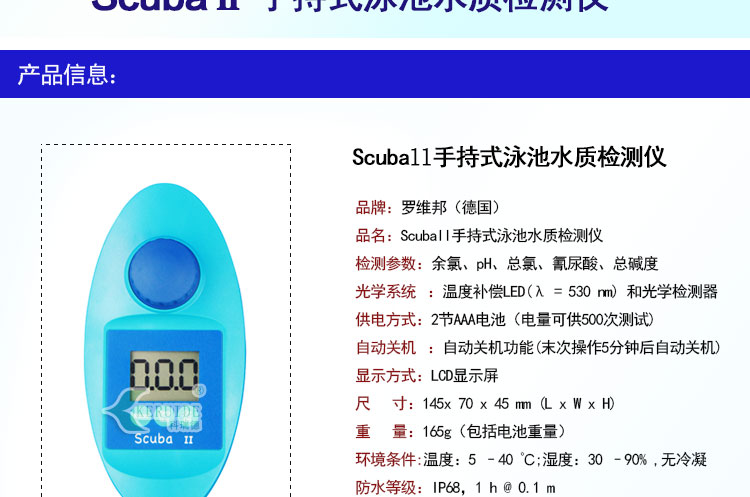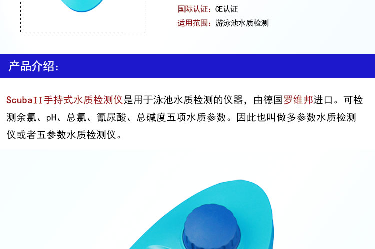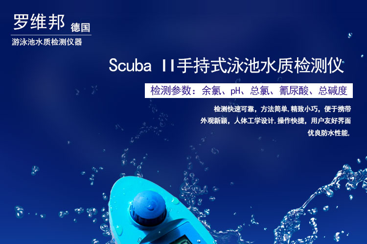 Scuba II手持式泳池水質(zhì)檢測(cè)儀是用于泳池水質(zhì)檢測(cè)的儀器,由德國(guó)羅維邦進(jìn)口。可檢測(cè)余氯、pH、總氯、氰尿酸、總堿度五項(xiàng)水質(zhì)參數(shù)。因此也叫做多參數(shù)水質(zhì)檢測(cè)儀或者五參數(shù)水質(zhì)檢測(cè)儀。