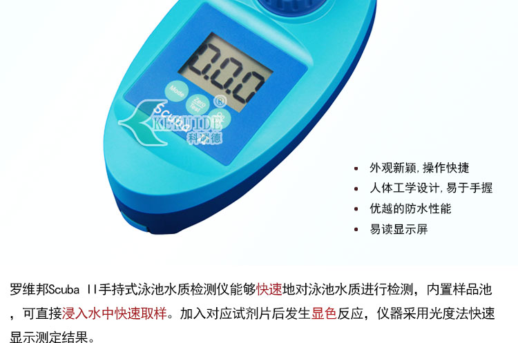羅維邦ScubaII手持式泳池水質(zhì)檢測(cè)儀能夠快速地對(duì)泳池水質(zhì)進(jìn)行檢測(cè),內(nèi)置樣品池,可直接浸入水中快速取樣。加入對(duì)應(yīng)試劑片后發(fā)生顯色反應(yīng),儀器采用光度法快速顯示測(cè)定結(jié)果。