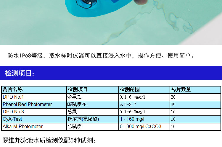 只需幾分鐘,羅維邦水質(zhì)檢測(cè)儀即可完成五項(xiàng)重要指標(biāo)測(cè)定(余氯,總氯,pH值,總堿度和氰尿酸)。檢測(cè)快速,水質(zhì)快速測(cè)定方法簡(jiǎn)單,無(wú)繁雜步驟,從而節(jié)省測(cè)試時(shí)間,達(dá)到快速檢測(cè)的目的。便于攜帶。儀器的形狀根據(jù)手形設(shè)計(jì),手握起來(lái)很舒適,使檢測(cè)工作能夠順利的進(jìn)行。