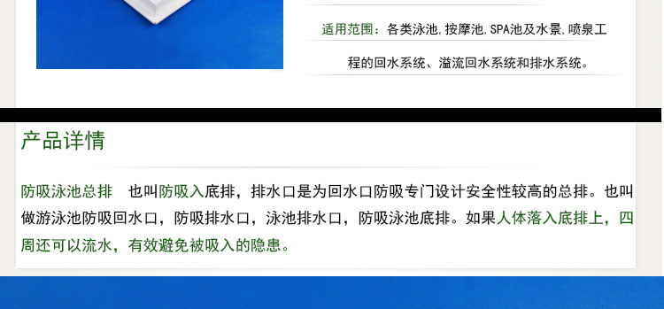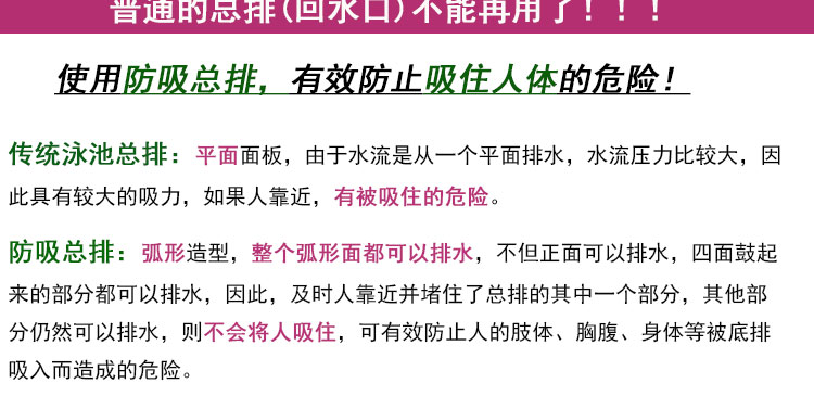 傳統的游泳池排水口表面為平面,排水時水流從同一個平面排水,造成的吸力非常大,容易發生險情。然而現在有了防吸回水口,能有效避免回水口吸人了的隱患。