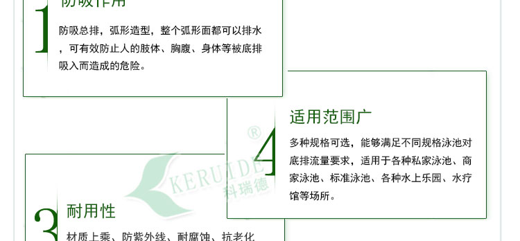 4、多種規格可選,能夠滿足不同規格泳池對底排流量要求,適用于各種私家泳池、商家泳池、標準泳池、各種水上樂園、水療館等場所。