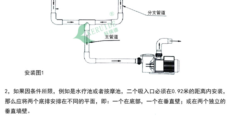 2,如果因條件所限,例如是水療池或者按摩池,二個吸入口必須在0.92米的距離內安裝,那么應將兩個底排安排在不同的平面,即:一個在底部,一個在垂直壁;或在兩個獨立的垂直墻壁。