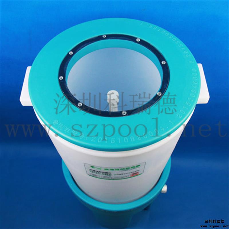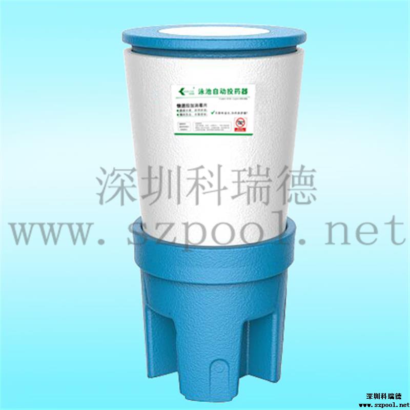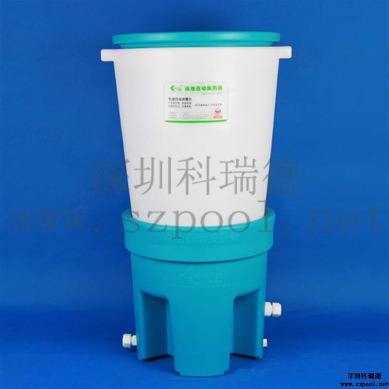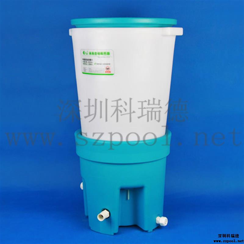 科瑞德?泳池自動投藥器是用于投加固體消毒片的投藥器,也叫泳池自動加藥桶,其采用的固液分離、即用即溶、桶內負壓、水隔式密封等技術手段,使得投藥器很適合用來自動投加固體消毒片,并且在投放過程中不會有氯味溢出。另外它還有一個特點,就是裝載量大,一次性可裝20kg的消毒片,可用的消毒片有復效凈泳池消毒片、泳池緩溶片等。