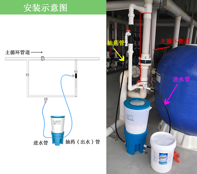 科瑞德?泳池自動投藥器利用泳池本身的循環系統,安裝簡單,采用循環系統進行高壓噴淋來溶解消毒片,其溶解速度快,使得投藥器能適合大的泳池進行自動投藥。 以下圖片為投藥器安裝示意圖: