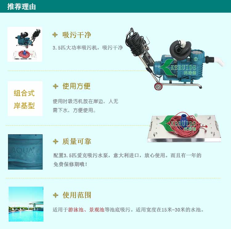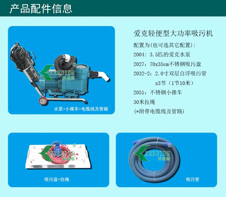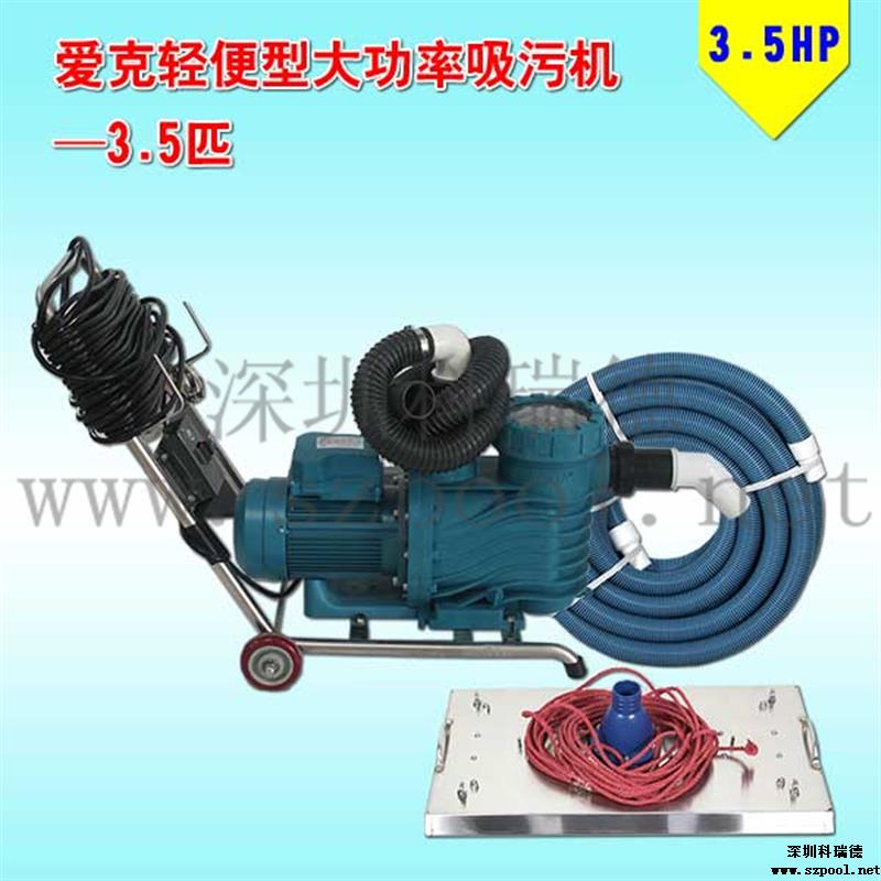 它的吸污泵為3.5匹愛克吸污泵,吸力足,吸污快。配備70x35cm的不銹鋼吸污盤,此吸污盤比一般的吸污頭幾乎要大一倍,并且有四個吸污進水口。它的吸污面積大,吸力強,與大功率吸污泵搭配,提高了吸污的效率(普通吸污盤壓不住這么強的吸力,很容易與吸污管脫離甚至浮上水面)。