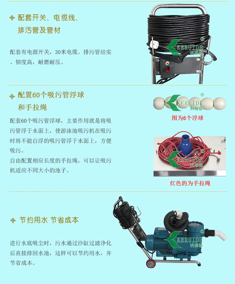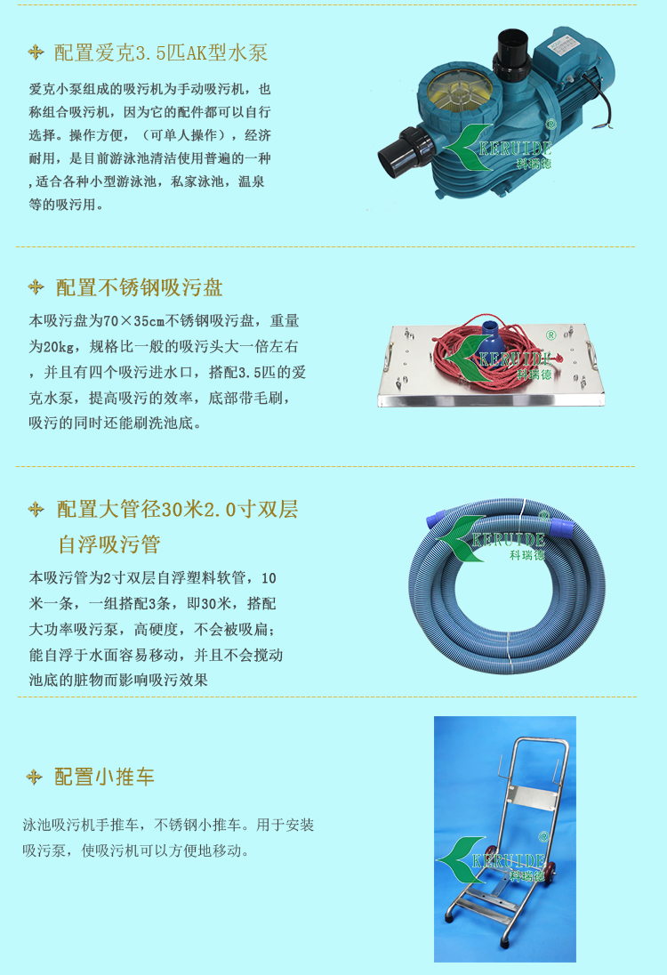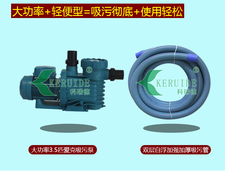 因為不銹鋼吸污盤的重量比較重,人工在拖動時會比較吃力,因為我們給此款吸污機搭配了1.5寸30米輕便型但又加強加厚的雙層自浮塑料軟管作為吸污管,它的特點:不會被壓扁,耐磨、耐壓,吸污時會自動浮于水面上,有效防止由于吸污移動而攪動池底的細小臟污引起水渾濁,也給人工拖動減少了很多壓力。