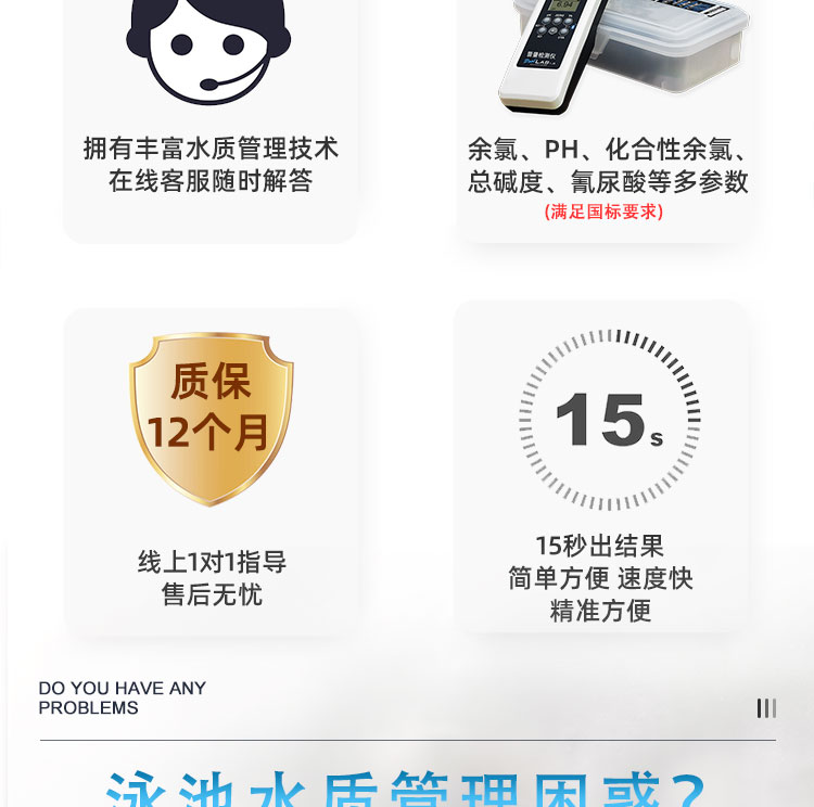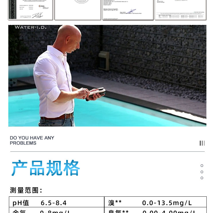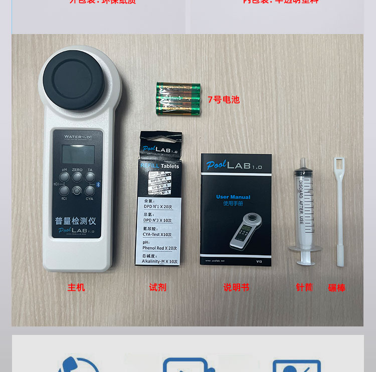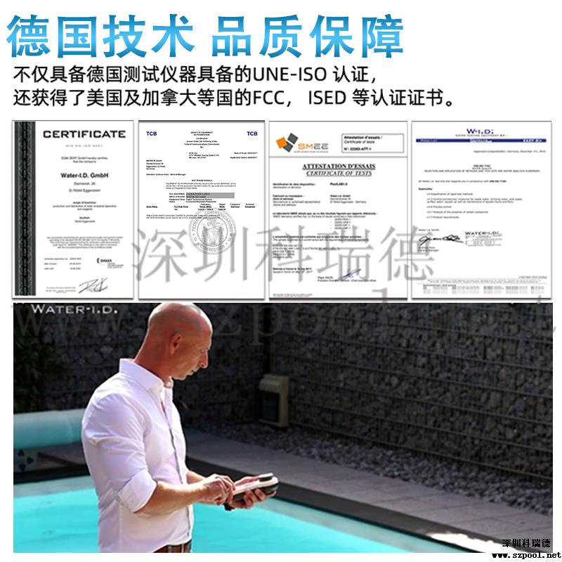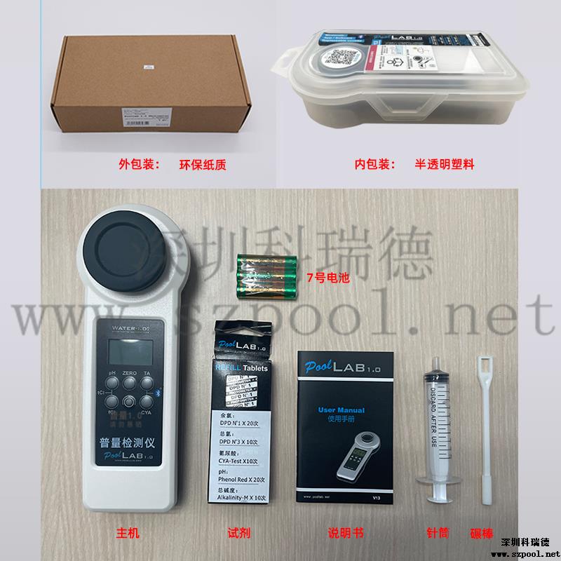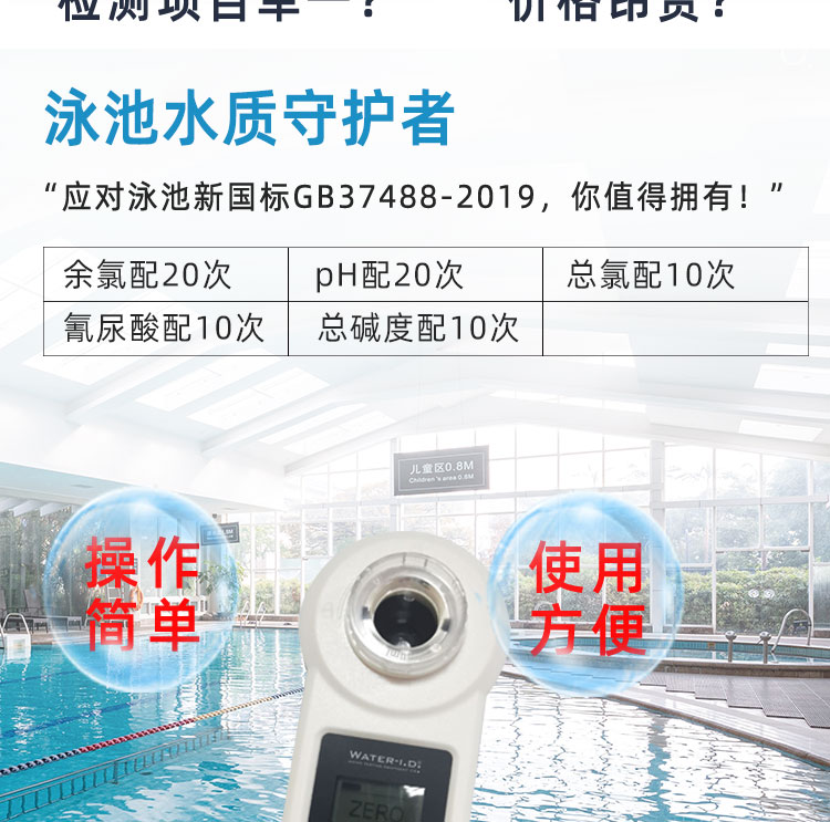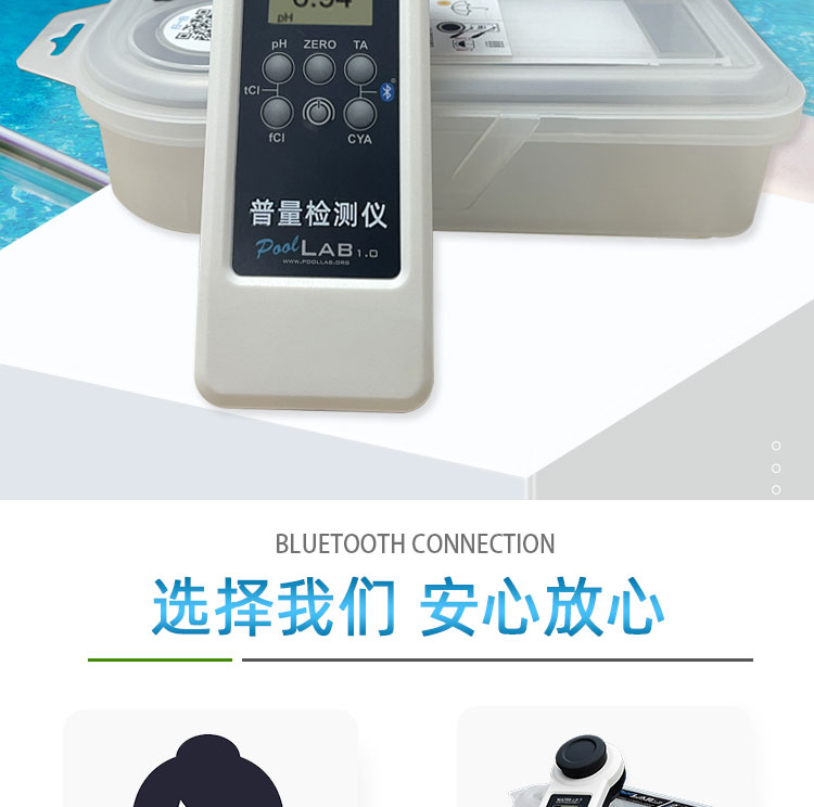 PoolLAB/普量水質(zhì)檢測(cè)儀是用于各類游泳池水質(zhì)檢測(cè)使用的儀器,它能檢測(cè)池水中:余氯/pH/氰尿酸/總堿度/結(jié)合性余氯/鈣硬度等13個(gè)項(xiàng)目指標(biāo),能快速檢測(cè),得出結(jié)果,使用簡(jiǎn)單、易懂、性能可靠等特點(diǎn),本款游泳池水質(zhì)檢測(cè)儀擁有IP68防水級(jí)別,在使用的過程不慎掉入水中或涉水不用擔(dān)心進(jìn)水,使用壽命長(zhǎng)且經(jīng)濟(jì)實(shí)惠,應(yīng)對(duì)國(guó)標(biāo)GB37488-2019水質(zhì)項(xiàng)目檢測(cè),每個(gè)游泳場(chǎng)所適合選擇。