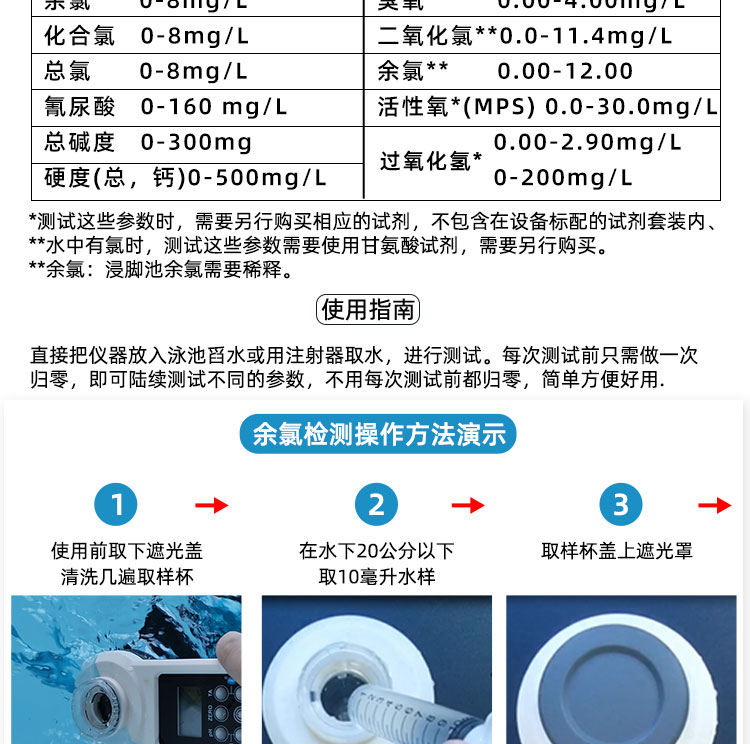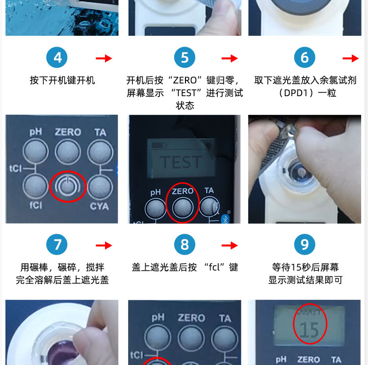 4. 如需測(cè)池水中的:余氯/氰尿酸,可以先加入余氯試劑,用碾棒碾碎溶解均勻,無殘留,蓋上遮光罩,按“fcl”鍵,等待15s,顯示測(cè)試結(jié)果后,清洗取樣槽,再次取水樣,加入氰尿酸試劑,碾碎溶解均勻,按“CYA”鍵,等待15s,顯示測(cè)試結(jié)果。(如果還想連續(xù)測(cè)試其它的指標(biāo),清洗取樣槽,重新取水樣,加入想測(cè)的試劑即可檢測(cè)了)以此類推!