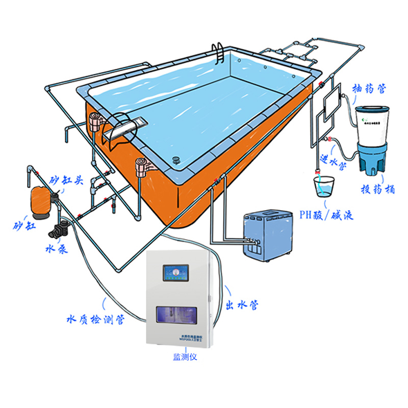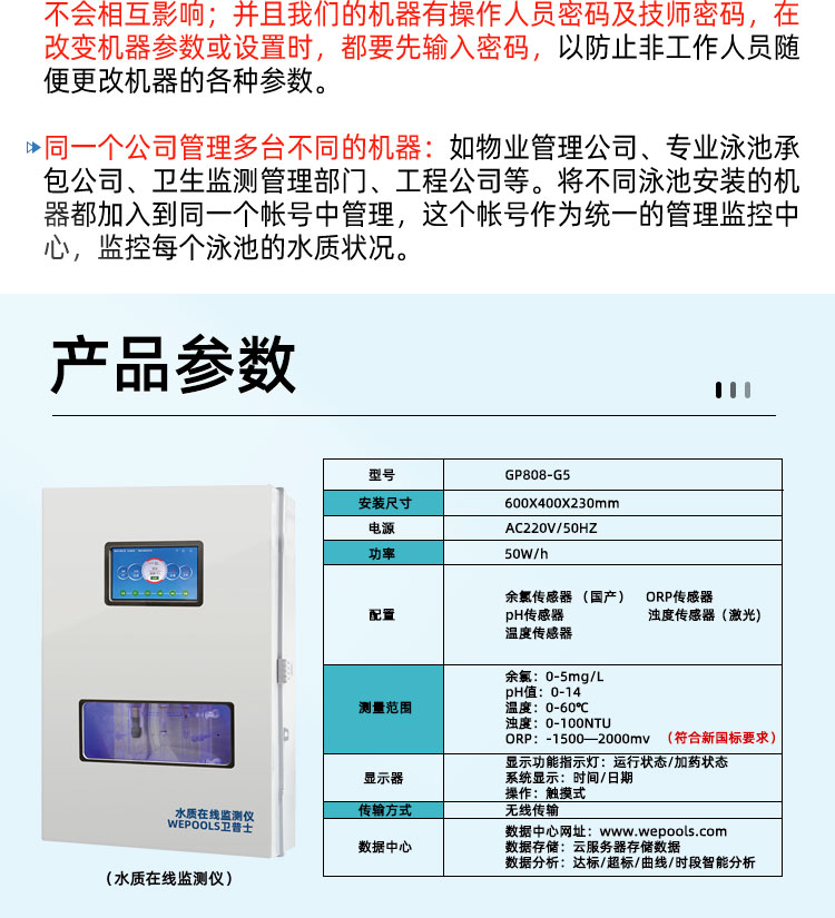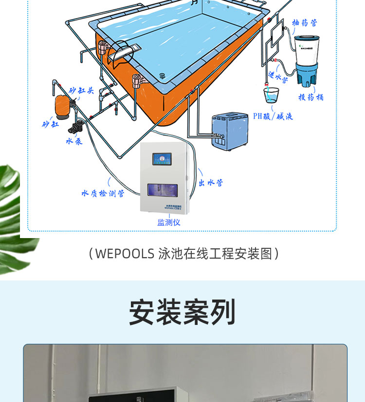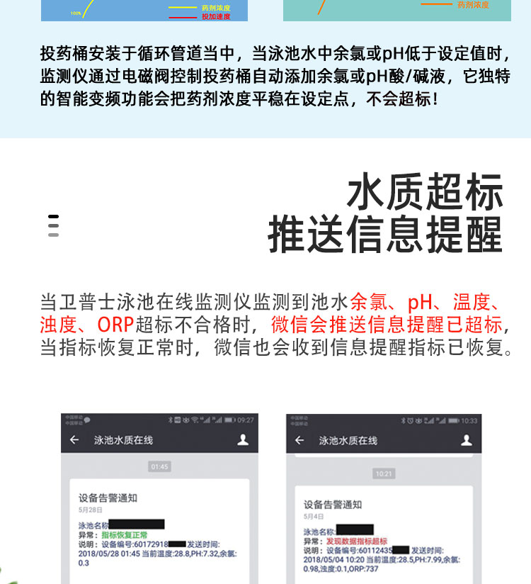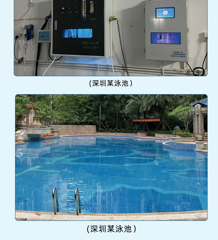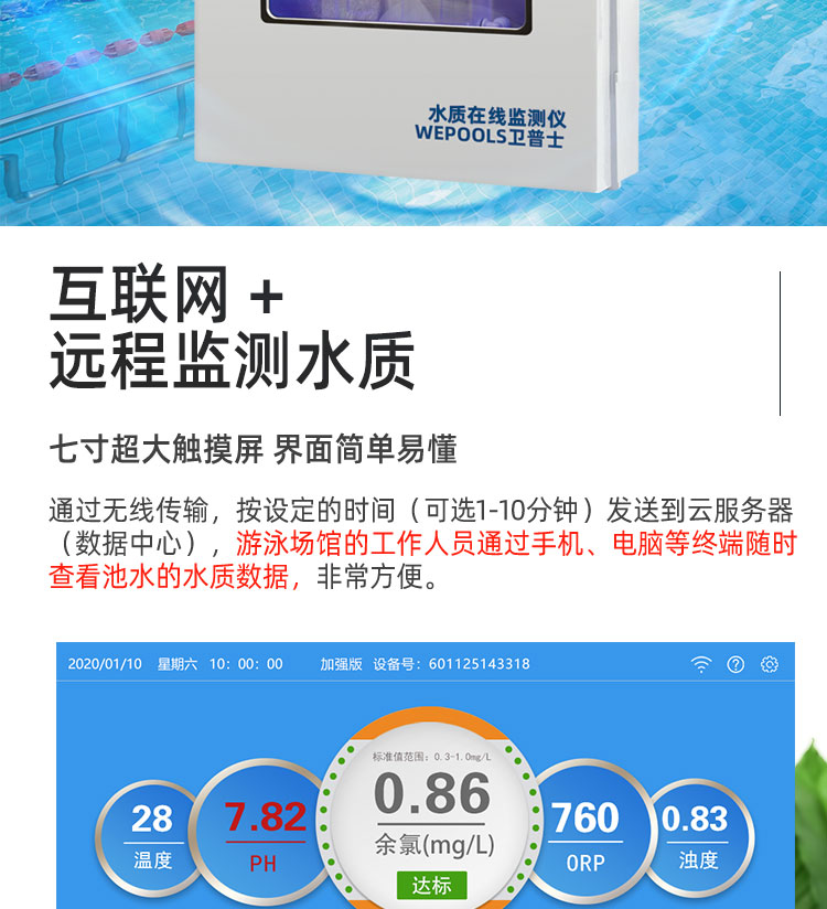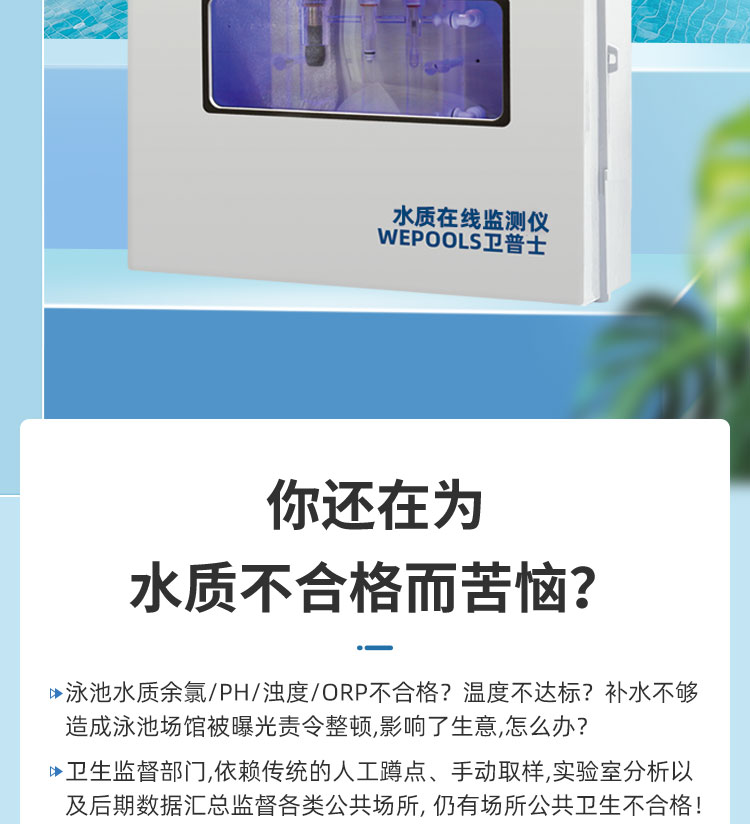 WEPOOLS 衛普士水質在線監測儀是一款實時在線監測泳池水質余氯/pH/濁度/ORP/溫度的監測儀。它與時俱進,符合新國標GB 37487-2019《公共場所衛生管理規范》、GB 37488-2019《公共場所衛生指標及限值要求》、GB 37489.3-2019《公共場所設計衛生規范第3部分:人工游泳場所》等三個國家標準的要求;它自動加(停)藥,保證水質余氯及PH達標,系統自動化加(停)藥控制系統,能根據當前檢測結果,自動調節加藥頻率,可以確保泳池水的余氯不隨天氣、泳客人數等因素變化的影響,保持池水余氯的相對穩定且符合標準,從而保證水質衛生。從根本上解決了A、人工加藥無法準確定量的問題;B、人工加藥無法達到均勻的問題;C、人工加藥無法持續不斷添加的問題;它自動傳輸信息和自動預警,使用單位、衛監部門可隨時掌握水質的動態變化和接收預警,敦促泳池工作人員加強水質管理,確保池水各項衛生指標在國家標準的限值范圍內。;它實現泳客的知情權,社會的監督權,泳池水質各項指標的實時監測結果會傳輸到顯示屏上對外公布,讓泳客對原本摸不著、看不見的水質狀況變為看得到、看得清的、實實在在的數據!