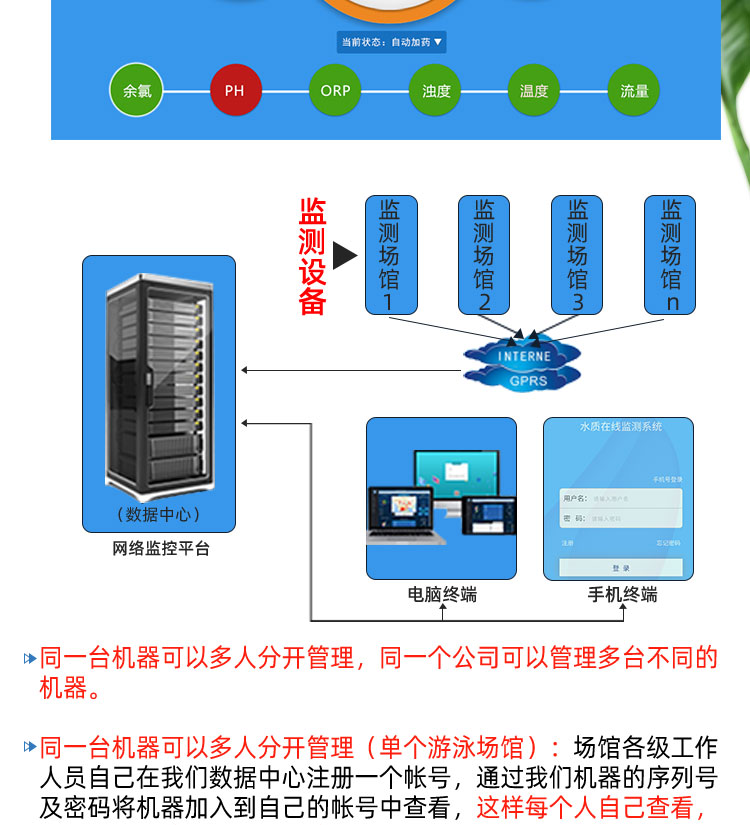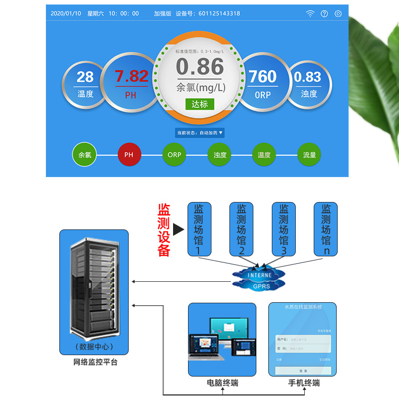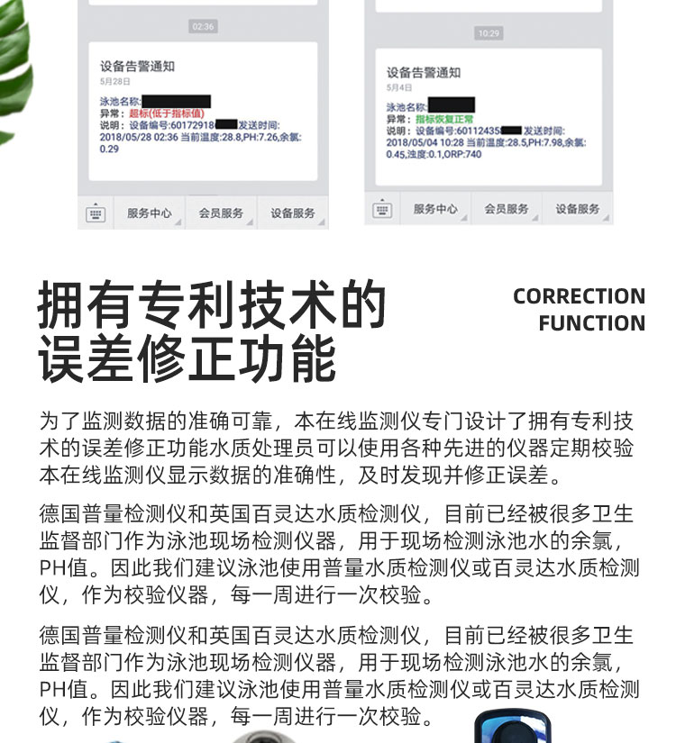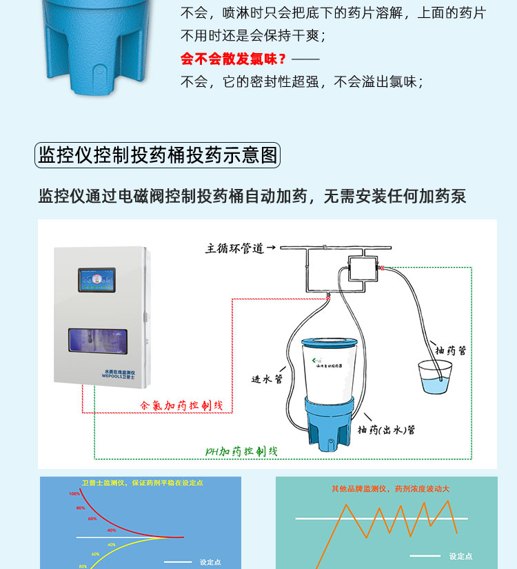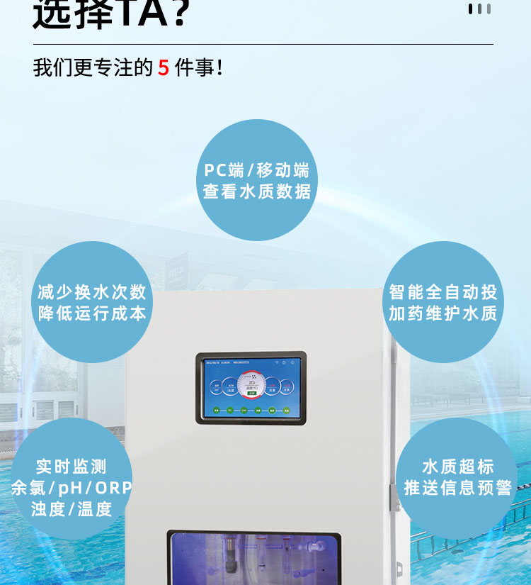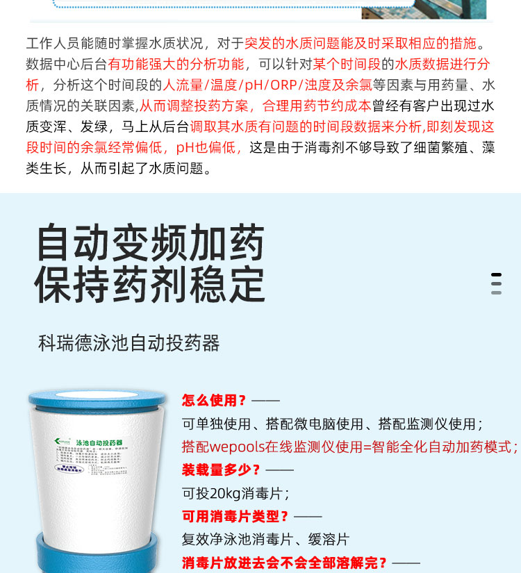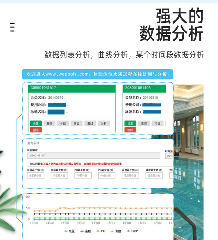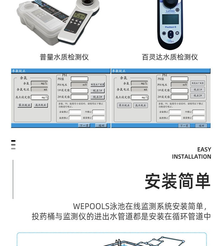 WEPOOLS 衛普士水質在線監測儀是一款實時在線監測泳池水質余氯/pH/濁度/ORP/溫度的監測儀。它與時俱進,符合新國標GB 37487-2019《公共場所衛生管理規范》、GB 37488-2019《公共場所衛生指標及限值要求》、GB 37489.3-2019《公共場所設計衛生規范第3部分:人工游泳場所》等三個國家標準的要求;它自動加(停)藥,保證水質余氯及PH達標,系統自動化加(停)藥控制系統,能根據當前檢測結果,自動調節加藥頻率,可以確保泳池水的余氯不隨天氣、泳客人數等因素變化的影響,保持池水余氯的相對穩定且符合標準,從而保證水質衛生。從根本上解決了A、人工加藥無法準確定量的問題;B、人工加藥無法達到均勻的問題;C、人工加藥無法持續不斷添加的問題;它自動傳輸信息和自動預警,使用單位、衛監部門可隨時掌握水質的動態變化和接收預警,敦促泳池工作人員加強水質管理,確保池水各項衛生指標在國家標準的限值范圍內。;它實現泳客的知情權,社會的監督權,泳池水質各項指標的實時監測結果會傳輸到顯示屏上對外公布,讓泳客對原本摸不著、看不見的水質狀況變為看得到、看得清的、實實在在的數據!