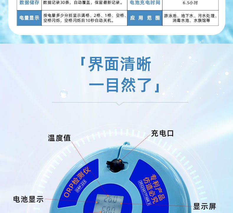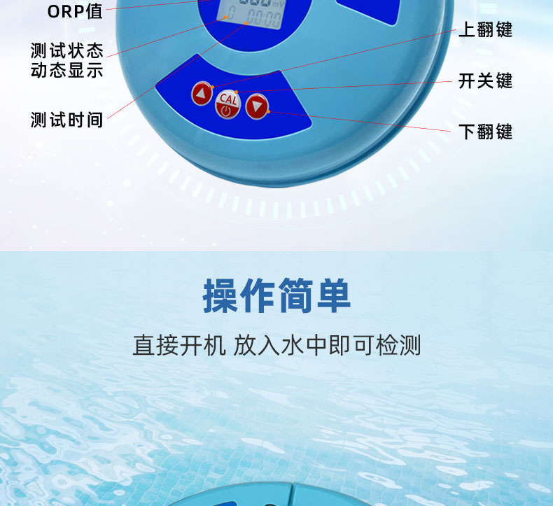 眾所周知,泳池營業(yè)時間都是爭分奪秒的,但是水質(zhì)問題卻會頻繁發(fā)生。有時候余氯很高,但是水質(zhì)還是發(fā)生渾濁或者其他問題,可能是ORP值造成的。ORP值可以用來監(jiān)測池水中消毒效果強弱,值的高低會與泳池的余氯/pH/濁度/溫度有關(guān),所以它也是一個重要的參數(shù)。泳池配備一臺ORP水質(zhì)檢測就非常有必要了??迫鸬翺RP檢測儀可大大改進氧化還原水處理技術(shù)的精準控制水平,從而提高水處理處理效果,這款ORP檢測儀界面清晰,一目了然,15分鐘可以快速地檢測出池水中的ORP值,滿足新國標GB37488-2019的要求。