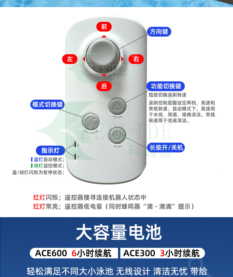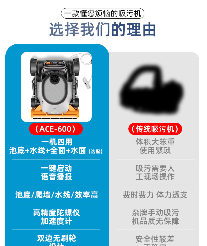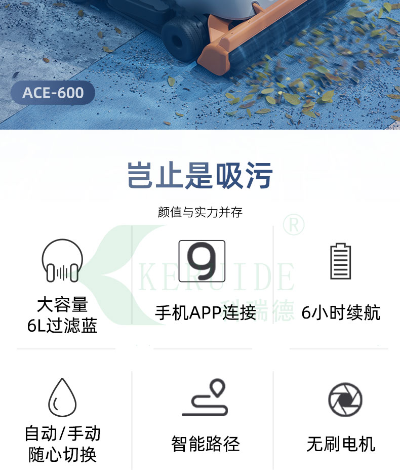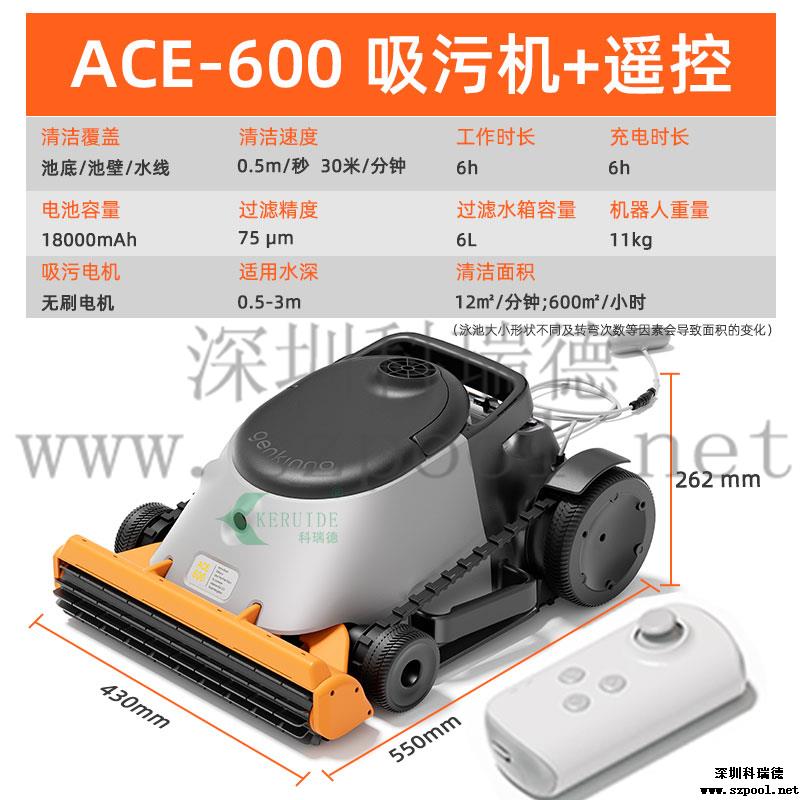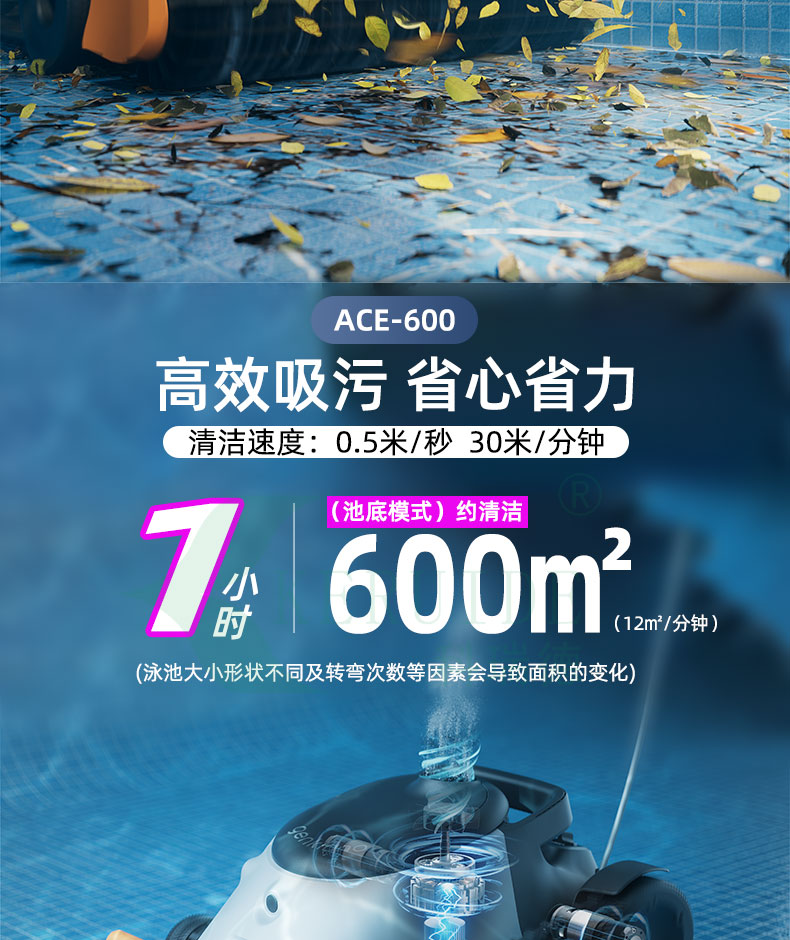 “ACE600全自動吸污機”續航高達6小時它能迅速將泳池底部的各類雜質,如灰塵、沙粒、毛發、
