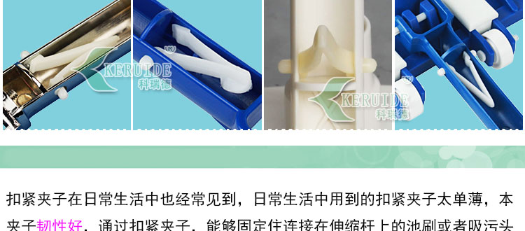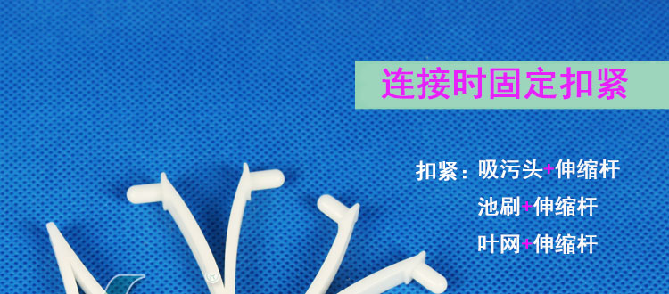 扣緊夾子在日常生活中也經常見到,日常生活中用到的扣緊夾子太單薄,本款夾子韌性好,通過扣緊夾子,能夠固定住連接在伸縮桿上的池刷或者吸污頭。并且,卸下來也方便。