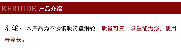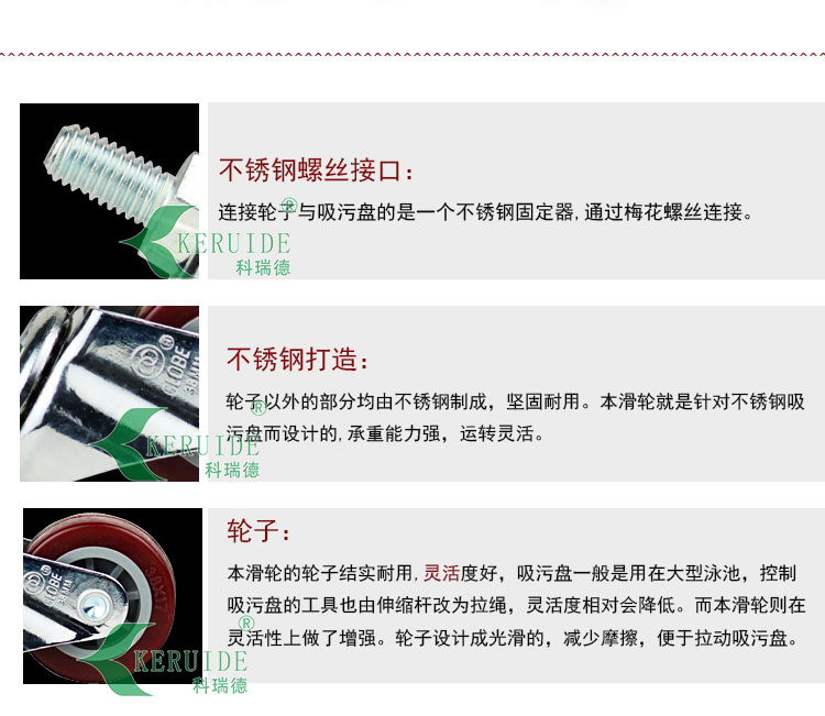 滑輪的輪子顏色為深棕色。連接輪子與吸污盤的是一個不銹鋼固定器,通過梅花螺絲連接。本滑輪靈活度好,吸污盤一般是用在大型泳池,控制吸污盤的工具也由伸縮桿改為拉繩,靈活度相對會降低。而本滑輪則在靈活性上做了增強。輪子設(shè)計成光滑的,減少摩擦,便于拉動吸污盤。