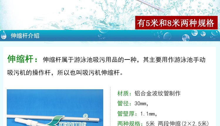 伸縮桿是泳池吸污機的主要配件之一,泳池手動吸污機(又叫岸基型吸污機,組合式吸污機)主要是泳池吸污泵與吸污管連接,吸污管的另一端與吸污頭連接,然后伸縮桿連接在吸污頭的手柄上,這樣就構(gòu)成了泳池吸污機,伸縮桿是操作人員控制吸污盤的工具。起著關(guān)鍵性的作用。