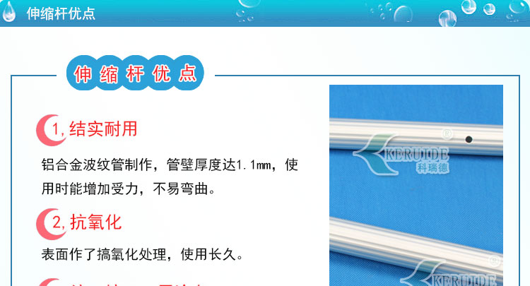 游泳池伸縮桿屬于游泳池吸污用品的一種配件。簡稱伸縮桿,因為主要作用是手動吸污機的操作桿,所以也叫吸污機伸縮桿,同時可以與救生鉤連接使用,所以也叫救生桿等。本產(chǎn)品使用優(yōu)質(zhì)的PVC制作,質(zhì)量可靠,人性化設(shè)計,不打滑,大小也正合適,是一款性價高泳池配件。