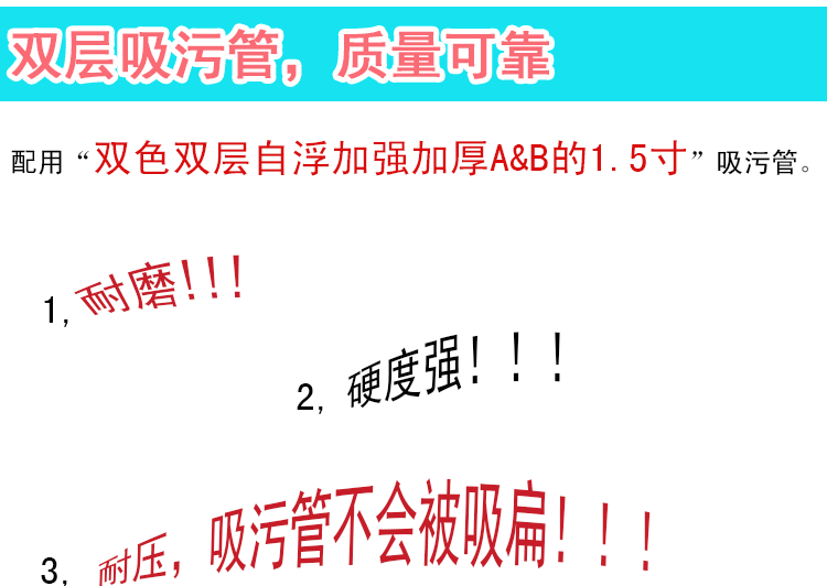 本游泳池吸污管是雙層管,夠硬度,不會被吸扁,耐壓耐用;能自浮于水面容易移動,并且不會攪動池底的臟物而影響吸污效果,是塑料吸污管中質量好的。