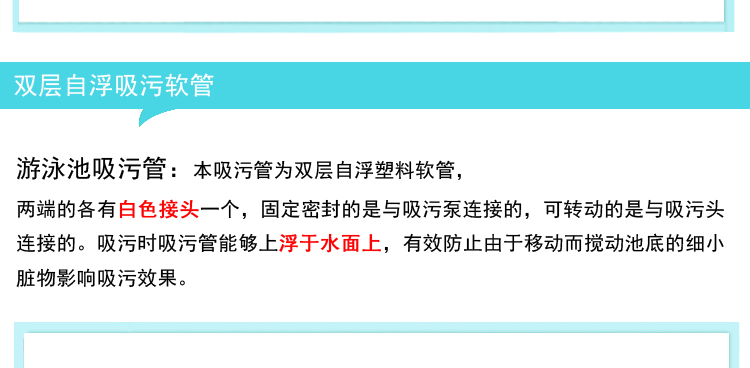 吸污管的兩端的各有白色接頭一個,固定密封的是與吸污泵連接的,可轉動的是與吸污頭連接的。吸污時吸污管能夠上浮于水面上,有效防止由于移動而攪動池底的細小臟物影響吸污效果。