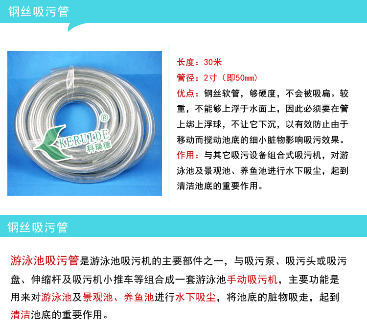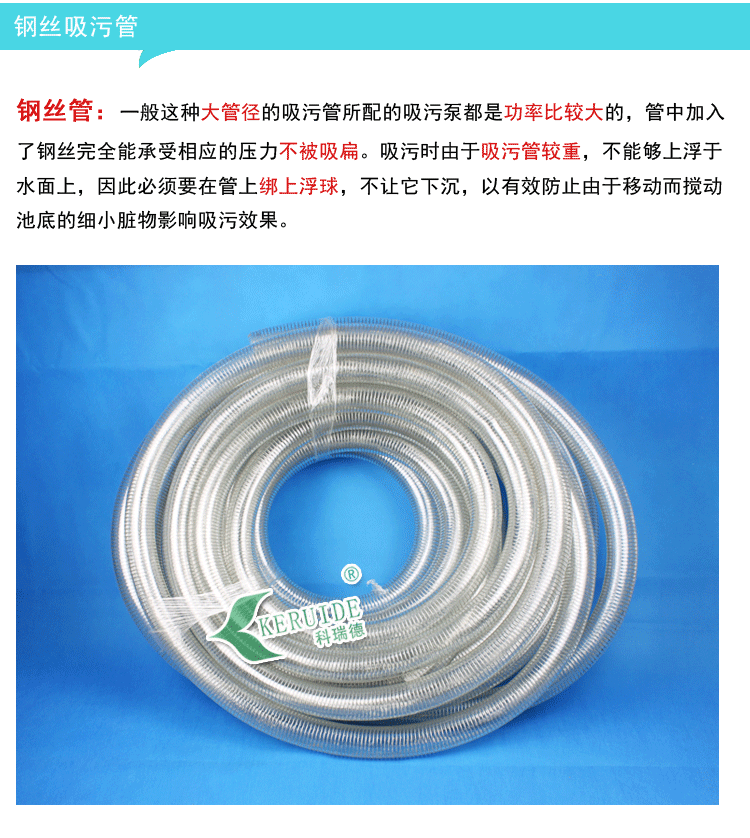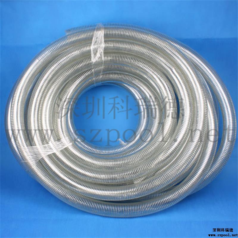 鋼絲吸污管是游泳池手動吸污機(jī)的主要部件之一,與吸污泵、吸污頭或吸污盤、伸縮桿及吸污機(jī)小推車等組合成一套完整的游泳池組合式吸污機(jī),主要功能是用來對游泳池及景觀池、養(yǎng)魚池進(jìn)行水下吸塵,將池底的臟物吸走,起到清潔池底的重要作用。