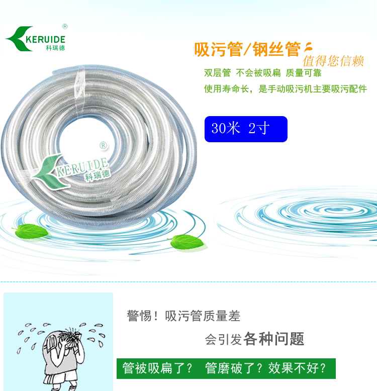 一般這種大管徑的吸污管所配的吸污泵都是功率比較大的,管中加入了鋼絲完全能承受相應(yīng)的壓力不被吸扁。吸污時由于吸污管較重,不能夠上浮于水面上,因此必須要在管上綁上浮球,不讓它下沉,以有效防止由于移動而攪動池底的細(xì)小臟物影響吸污效果。