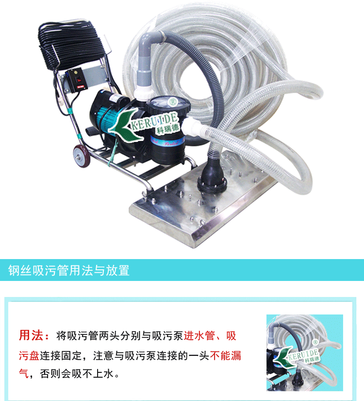 將鋼絲吸污管的兩頭分別與吸污泵進(jìn)水管、吸污盤連接固定,注意與吸污泵連接的一頭不能漏氣,否則會吸不上水。適用于游泳池手動吸污機(jī)