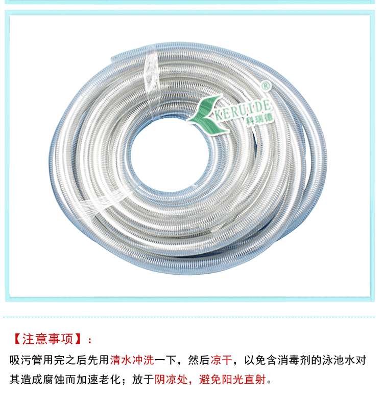 吸污管用完之后最好用清水沖洗一下,以免含消毒劑的泳池水對其造成腐蝕而加速老化;放于陰涼處避免陽光直射。