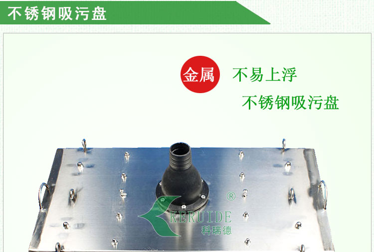 吸污盤的規格比一般的吸污頭大一倍左右,并且有四個吸污進水口,所配的水泵也相應較大,因此吸污的速度及效率大大增加;