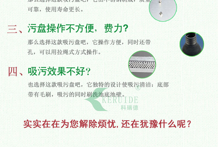 如果你覺得你的吸污盤不夠大,吸污花的時間很多,那么就選擇這種吸污盤吧,它的面積非常大,吸污速度快,可以減少吸污時間。如果你覺得你的吸污盤質量不夠好,怕使用的時間不夠長,那么選擇這款吸污盤吧,它全部由不銹鋼制成,質量有保障,使用壽命更長。如果你覺得你的泳池吸污盤操作不方便,費力,那么選擇這款吸污盤吧,它操作非常方便,同時還帶孔,可以用拉繩式方式操作。如果你覺得你的泳池吸污盤效果不好,也選擇這款吸污盤吧,它獨特的設計使吸污清潔:底部帶毛刷,吸污的同時刷洗池底池壁。