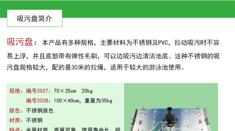 吸污盤:本產品為不銹鋼吸污盤,主要材料為不銹鋼及PVC,重量達到20公斤,拉動吸污時不容易上浮,并且底部帶有彈性毛刷,可以邊吸污邊清潔池底。這種不銹鋼的吸污盤規格較大,配的是30米的拉繩,適用于較大的游泳池使用。