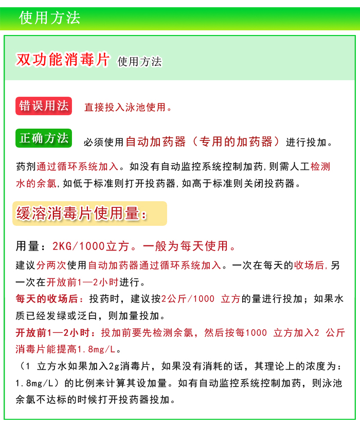 游泳池緩溶消毒片一般為每天使用,分兩次使用自動加藥器通過循環系統加入,一次在每天的收場后,投藥時,按2 公斤/1000 立方的量進行投加;如果水質已經發綠或泛白,則要加量投加。另一次在開放前1—2小時進行。緩溶消毒片投加前要先檢測余氯,然后按每1000 立方加入2 公斤消毒片能提高1.8mg/L (1 立方水如果加入2g三氯消毒片,如果沒有消耗的話,其理論上的濃度為:1.8mg/L)的比例來計算其設加量。如有自動監控系統控制加藥,則泳池余氯不達標的時候打開投藥器投加。