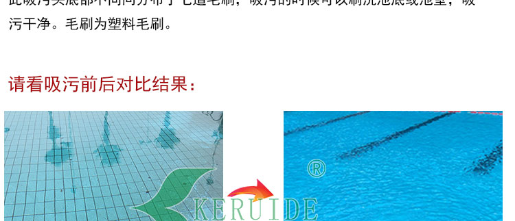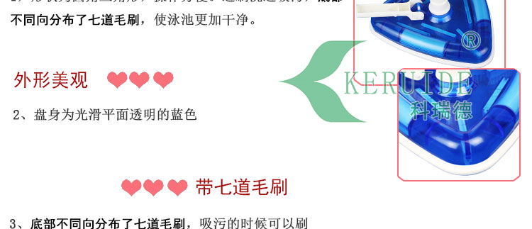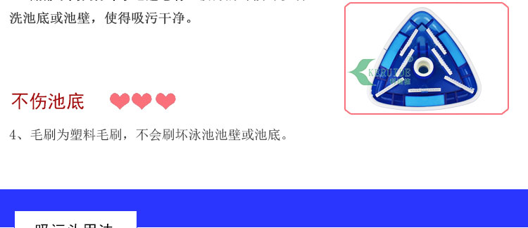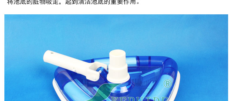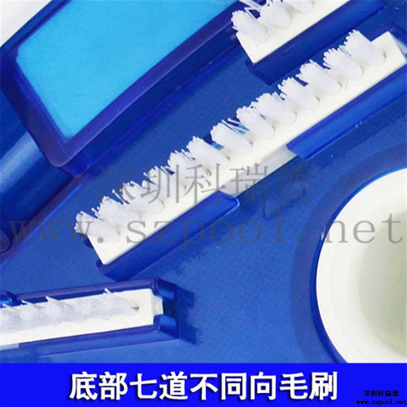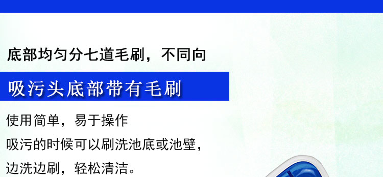 2、實用:塑料手柄,方便實用。盤底在吸污口周圍不同方向的分布了7道塑料毛刷,吸污之前將頑固附著于池底的臟物刷起,便于吸走,讓吸污方便,快速。塑料毛刷不傷池底,適合于任何材質的泳池。
