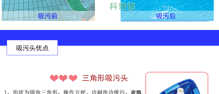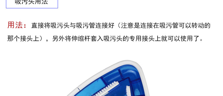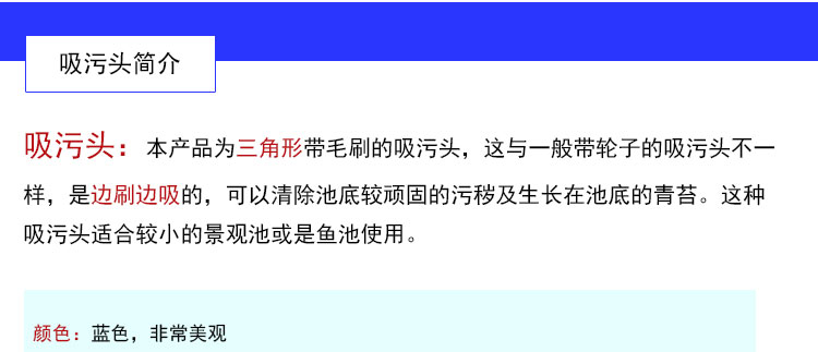 1、美觀:如果去選購吸污頭,這一款吸污頭應該是第一個看到的,因為它造型美觀,為透明三角形,透明的藍加白色,經(jīng)典配色,優(yōu)雅。