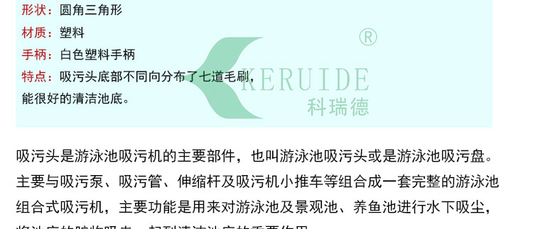 吸污頭(5528BU)是游泳池吸污機的主要部件,本吸污頭外形為三角形,并且?guī)в忻?外型美觀,并且使用簡單。吸污頭主要是與吸污泵,吸污管,伸縮桿等組合成手動吸污機,用于泳池池底,景觀池水底,桑拿池池底,水上樂園水底吸污,吸污頭是吸污機的主要配件。