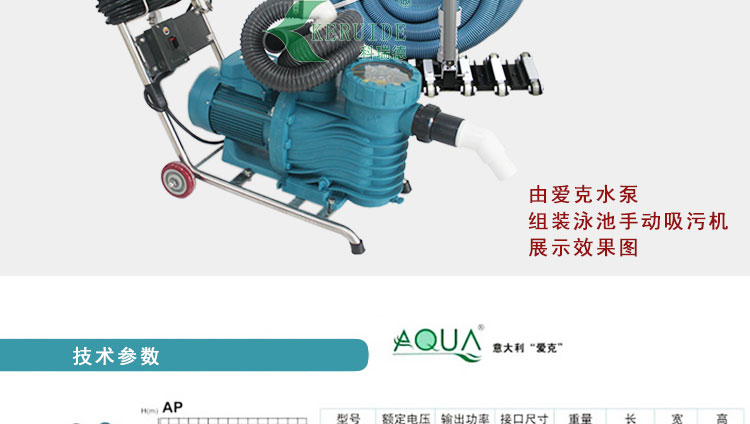 在國內,愛克吸污泵質量可靠、簡易的操作、多種型號規格,它分為不同的功率,結合各種大小泳池使用,本款吸污機適合小型泳池或,溫泉桑拿處的吸污,單人操作,使用方便。