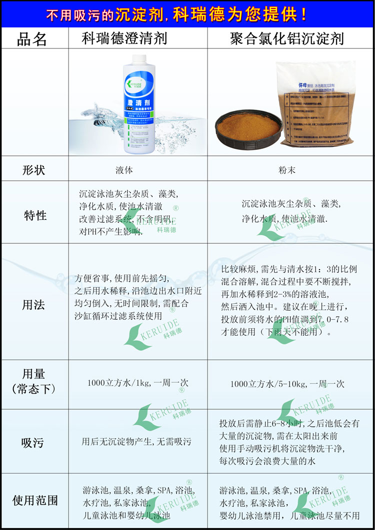 ? ? ? ?科瑞德澄清劑是一種濃縮的溶于水的DMDAAC聚合物,帶有正電荷,所以是陽離子澄清劑,很容易和泳池、溫泉及各種桑拿水療池水中帶有負電荷的懸浮顆粒結合,然后通過傳統的泳池過濾系統將懸浮物過濾掉,讓水變得清澈湛藍!它不含明礬,對PH不產生影響,使用方便,無需稱量無需提前溶解,無時間限制,直接沿著出水口附近均勻倒入即可,用后無沉淀物產生,無需吸污,能節省大量的水資源。