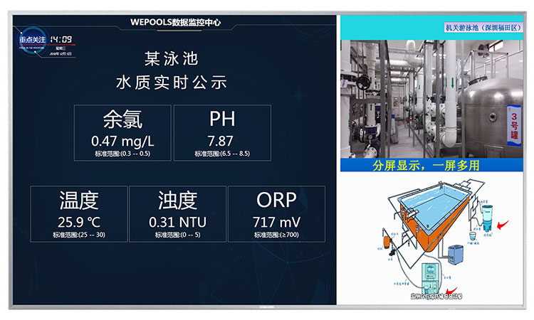 水質(zhì)實(shí)時(shí)公示屏的設(shè)計(jì)理念是為解決目前泳池手寫水質(zhì)數(shù)據(jù)公示的落后方式而研發(fā)的。目前大部份泳池都是以手寫水質(zhì)數(shù)據(jù)來進(jìn)行公示的,這個(gè)公示形同虛設(shè),根本沒起到相應(yīng)的作用。我們的水質(zhì)實(shí)時(shí)公示屏是將水質(zhì)在線監(jiān)測儀檢測到泳池的實(shí)時(shí)數(shù)據(jù)直接通過本屏進(jìn)行公示,其數(shù)據(jù)是實(shí)時(shí)、動(dòng)態(tài)及真實(shí)的。并且本屏還能通過分屏設(shè)置,給公眾展示游泳場館的各類設(shè)施及宣傳,達(dá)到一屏多用的效果。
