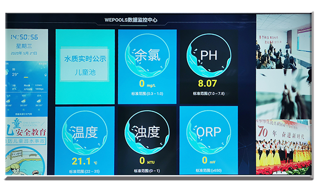 ????公示屏:水質(zhì)實時公示屏,在線監(jiān)測儀能連接到公示屏上,市民可以實時查看泳池溫度、pH、余氯等指標,公示屏有壁掛式和立式兩種,一般放在泳池旁或收銀大廳都可以。