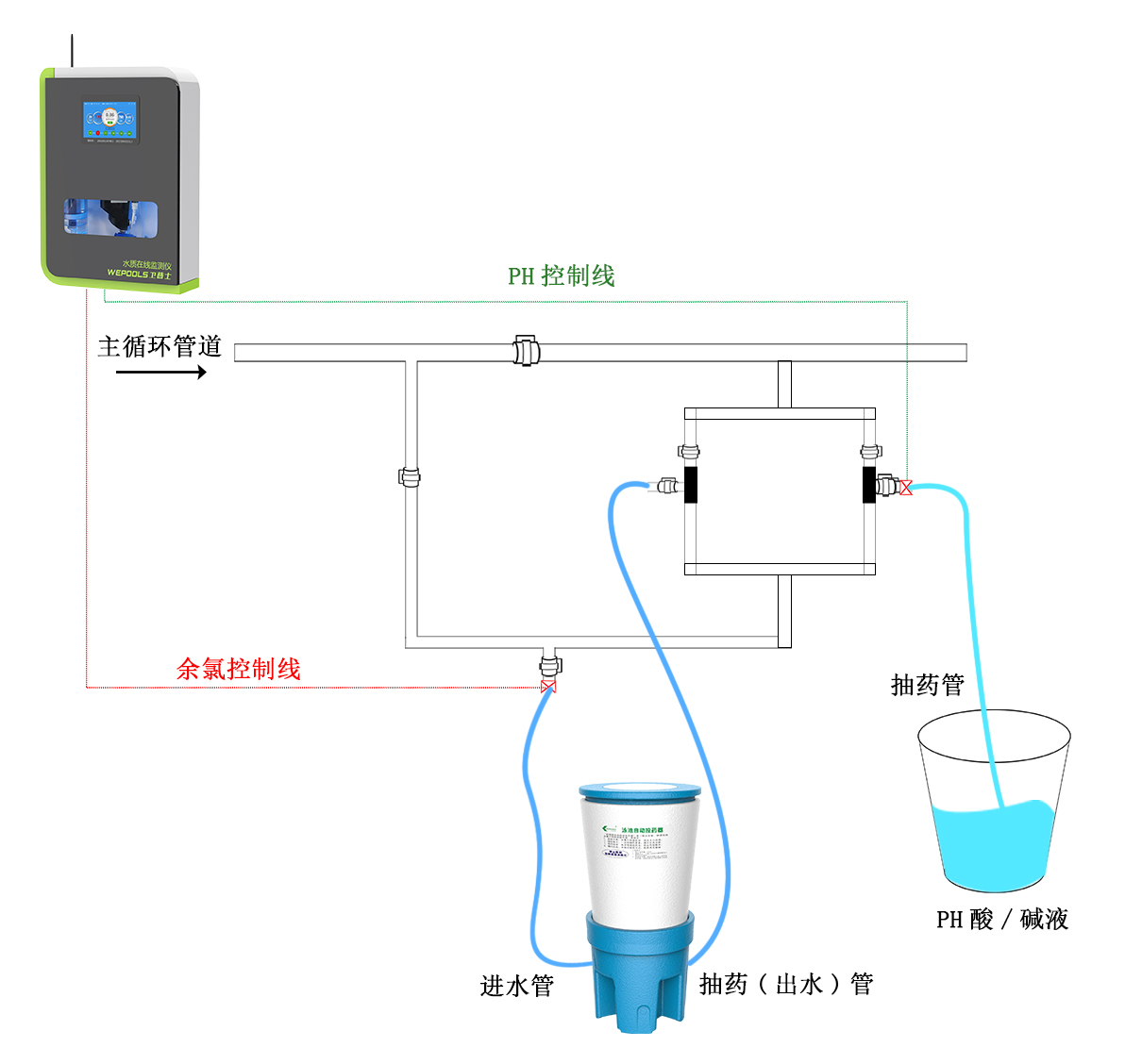 泳池自動投藥器配合泳池在線監測儀使用,輕松管理水質。泳池在線監測儀實時在線監測泳池余氯/pH/濁度/ORP/溫度,能根據實時監測到的水質數據,控制投藥泵投加頻率形成一套完整的自動投藥系統。