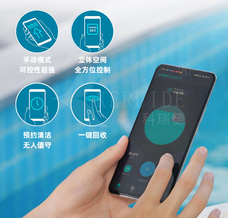 可以通過專屬軟件手機遠程操作預約清潔{定時/延時}無需人工值守,一鍵可收回,輕松的進行水下清潔,讓你不再厭倦吸塵工作,夏季泳客多,每天閉館做一次吸污完全不會耽誤場館第二天的運作。