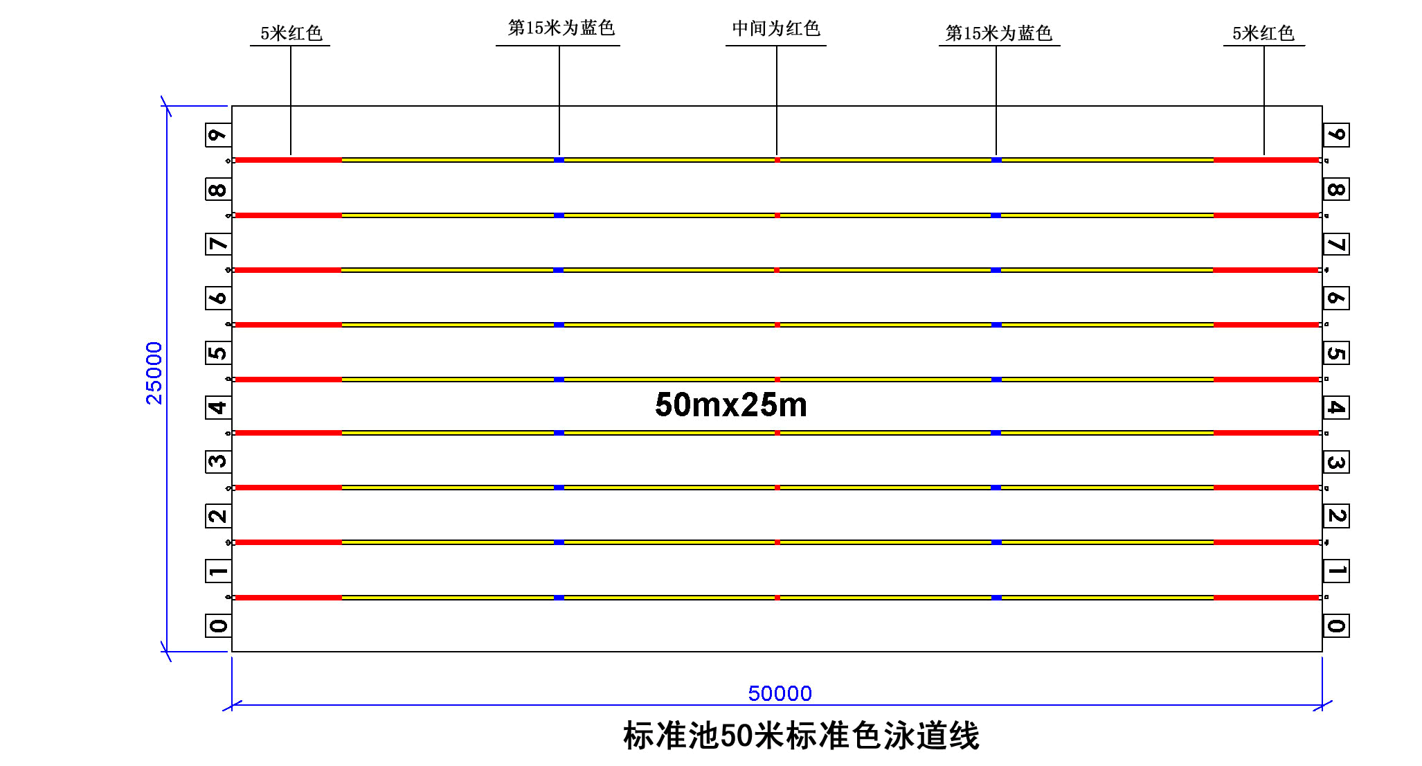 其他泳池泳道線展示(以下的這幾種只要記住一米為10個風車,分清顏色,計算一下就很容易了):
